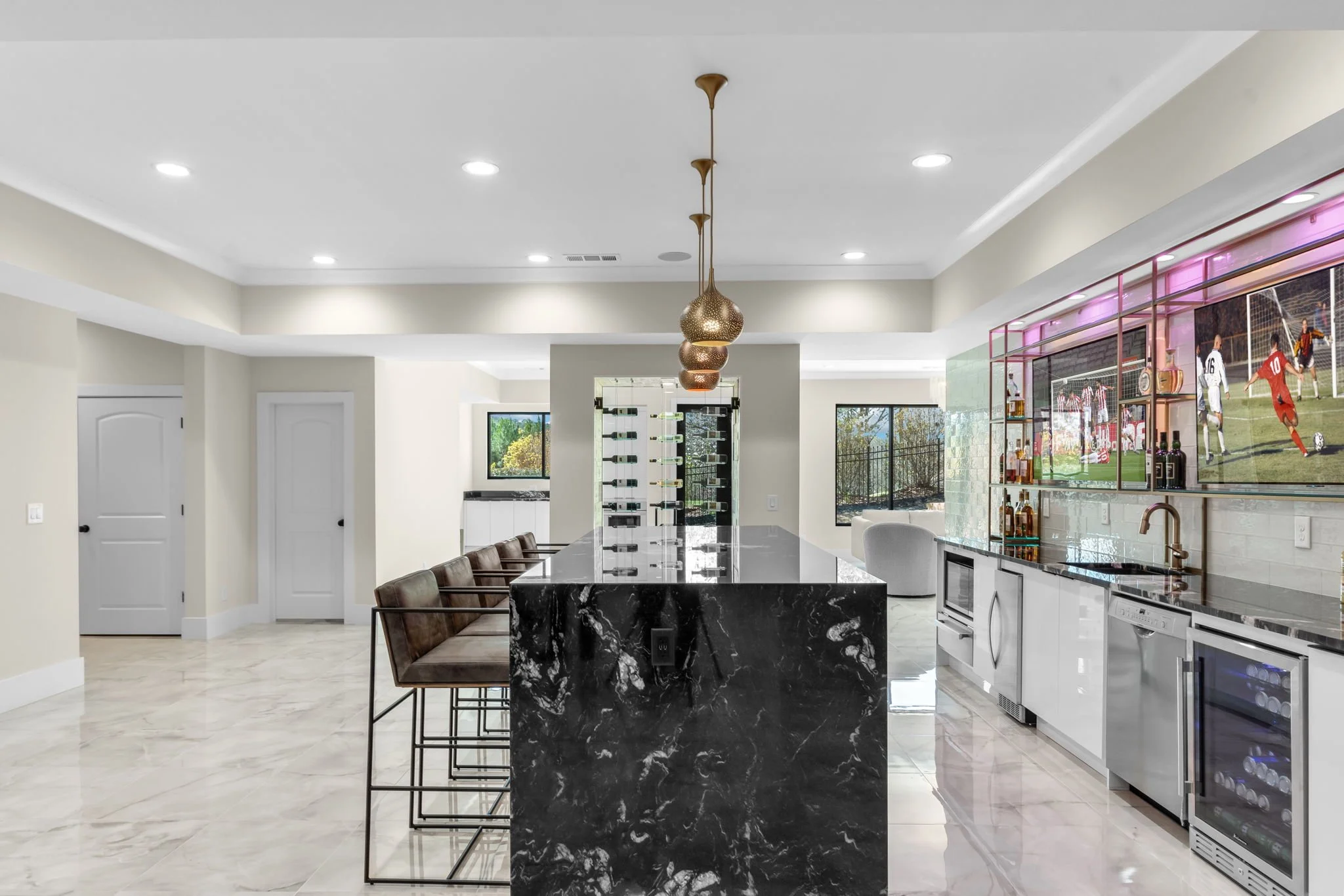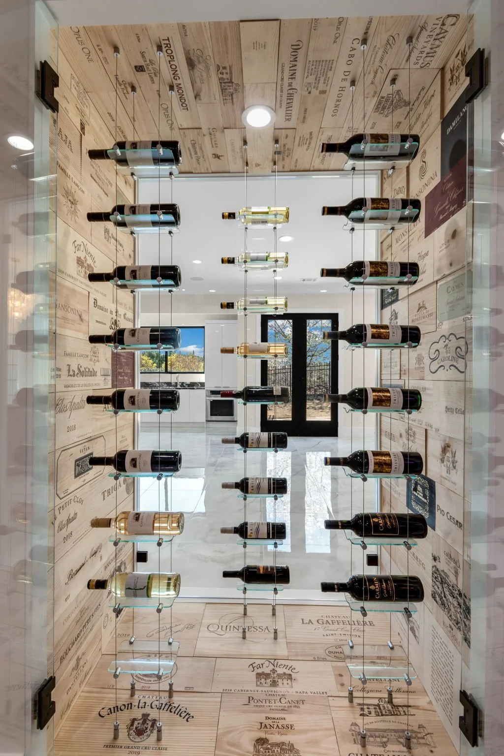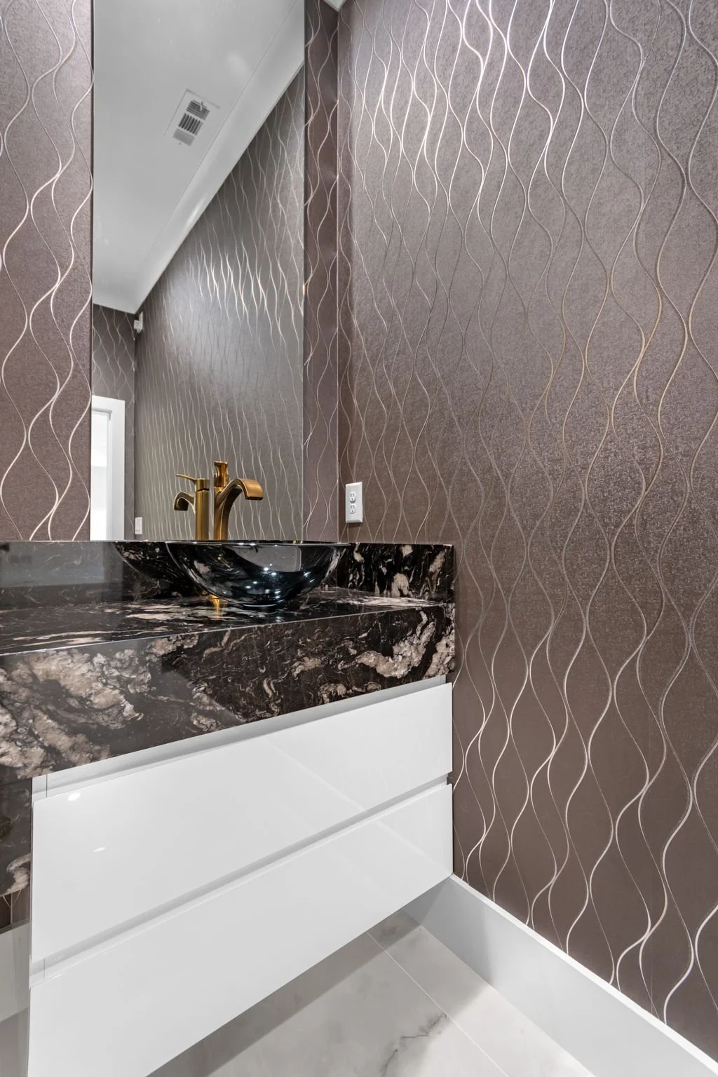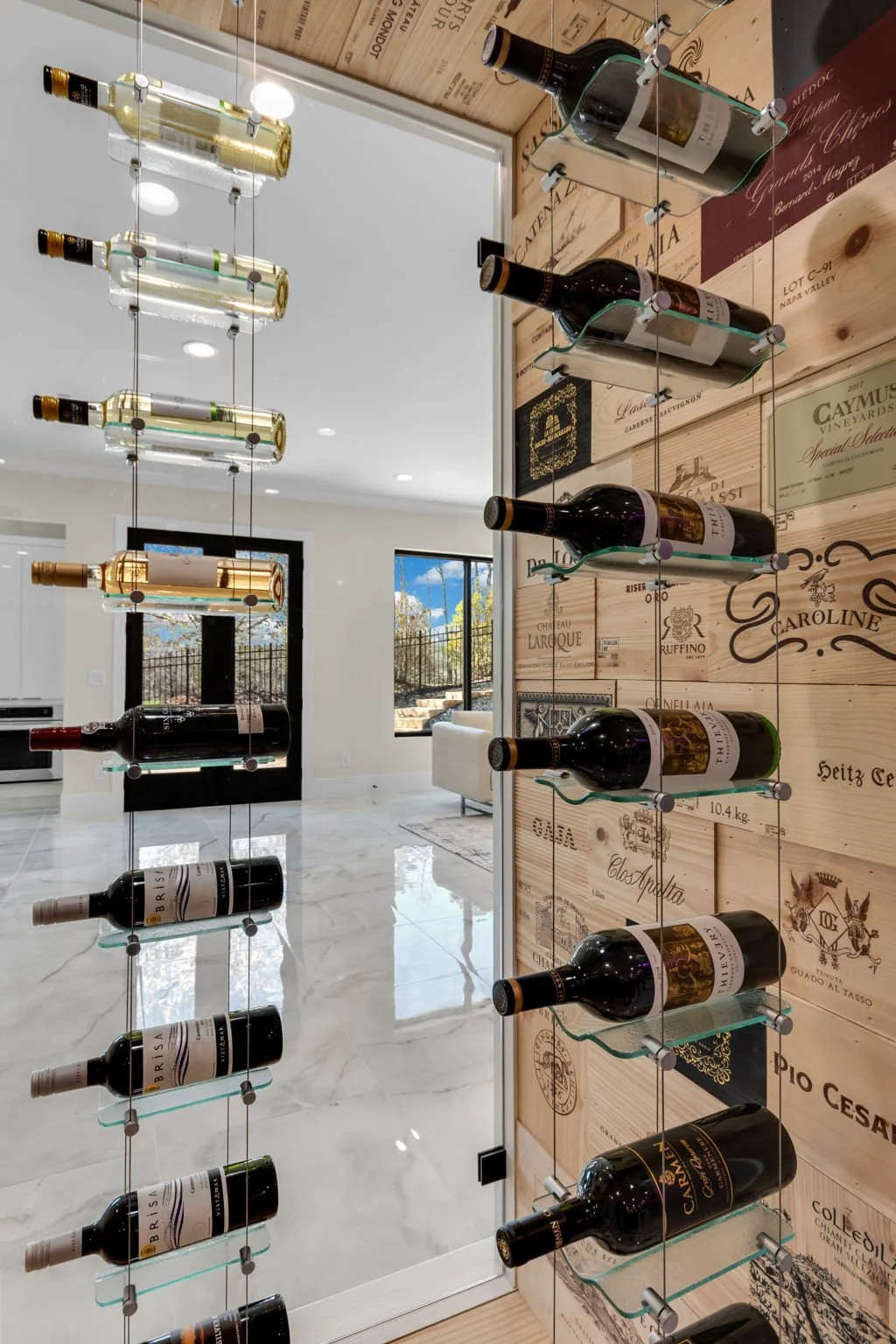 Adding to the allure, floating wine bottle displays cascade effortlessly, while custom granite vanity countertops in the guest bathroom exude opulence. Wallpapered walls add a touch of sophistication, completing the ambiance of refined luxury in every corner.