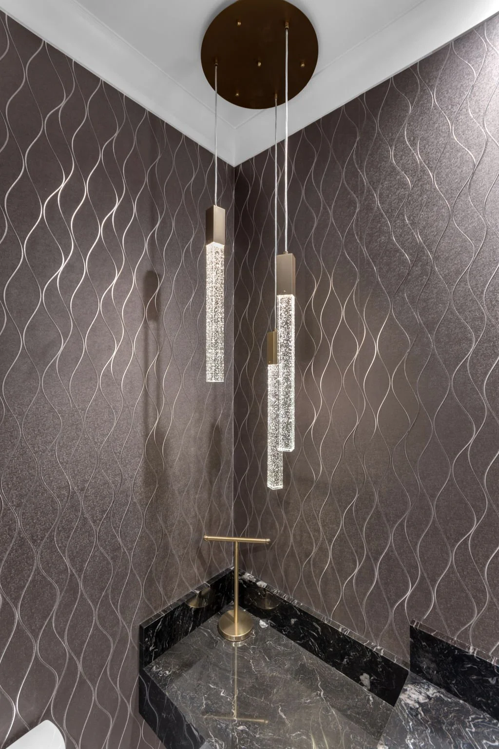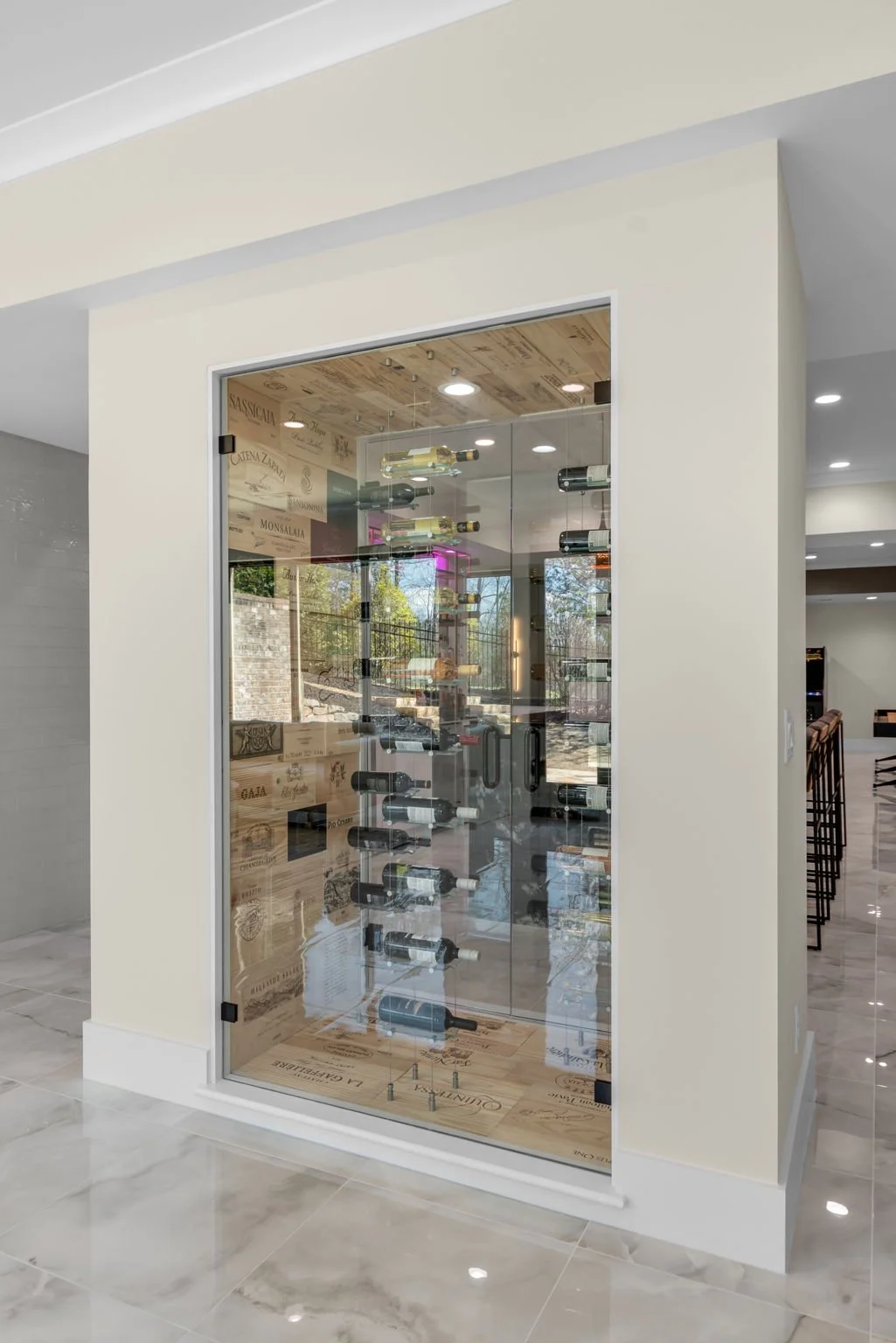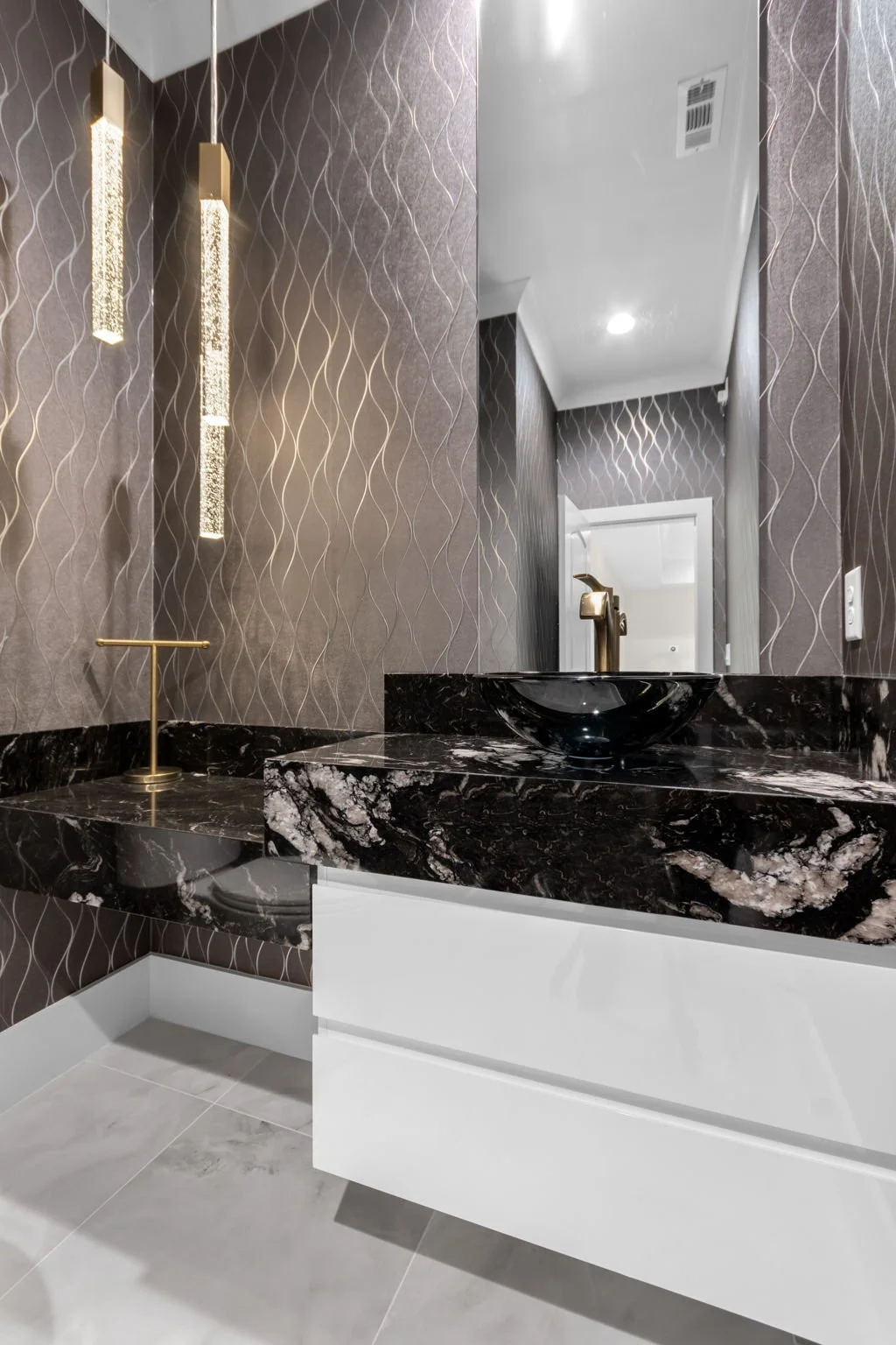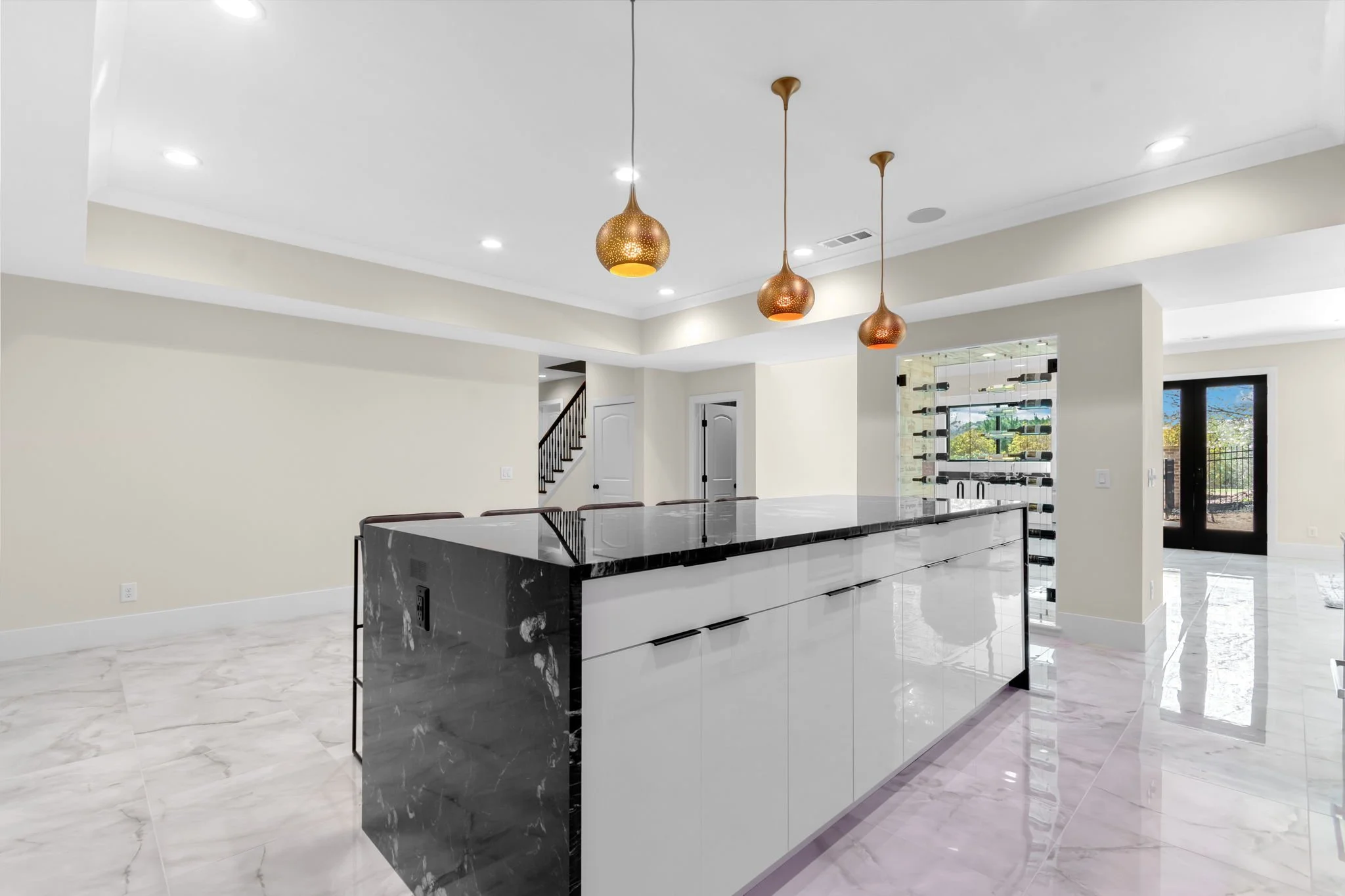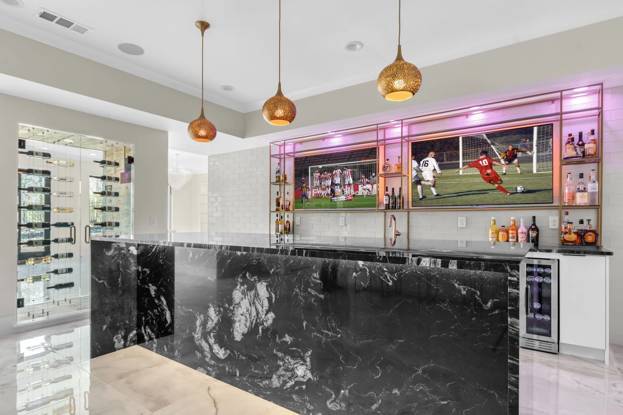 Adding to the allure, floating wine bottle displays cascade effortlessly, while custom granite vanity countertops in the guest bathroom exude opulence. Wallpapered walls add a touch of sophistication, completing the ambiance of refined luxury in every corner.