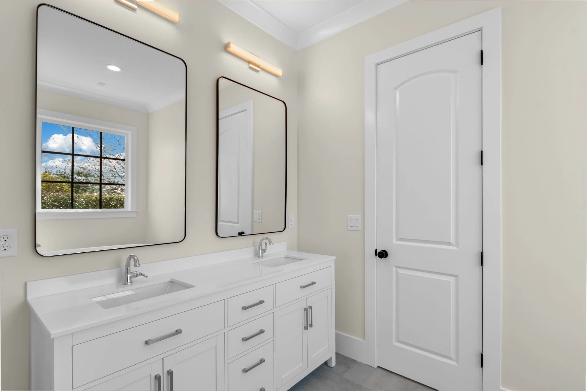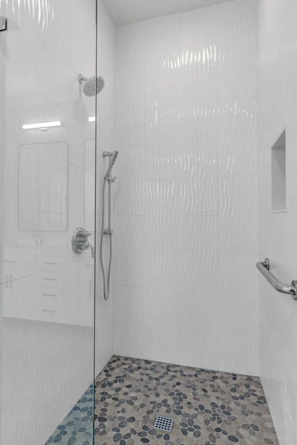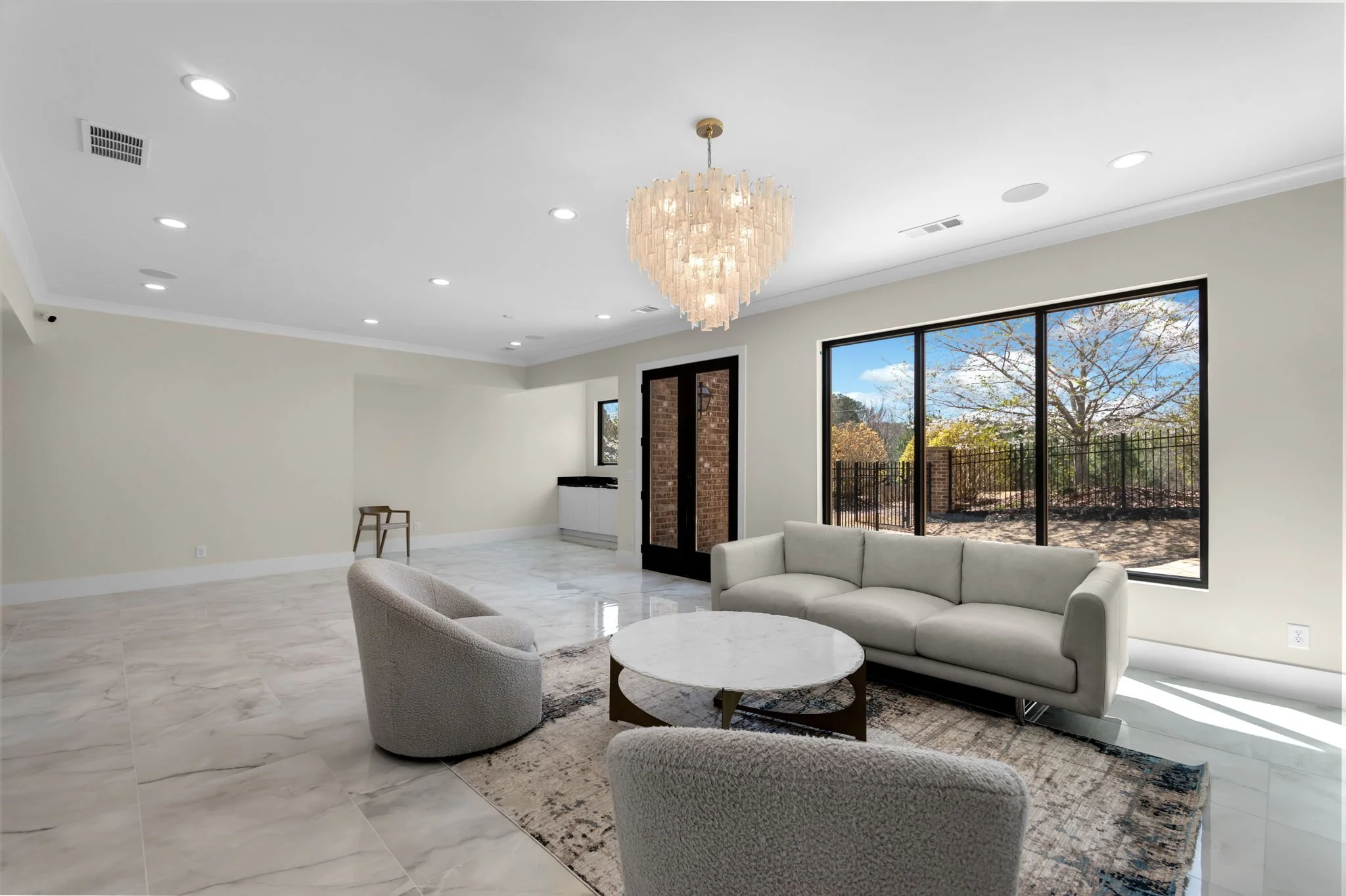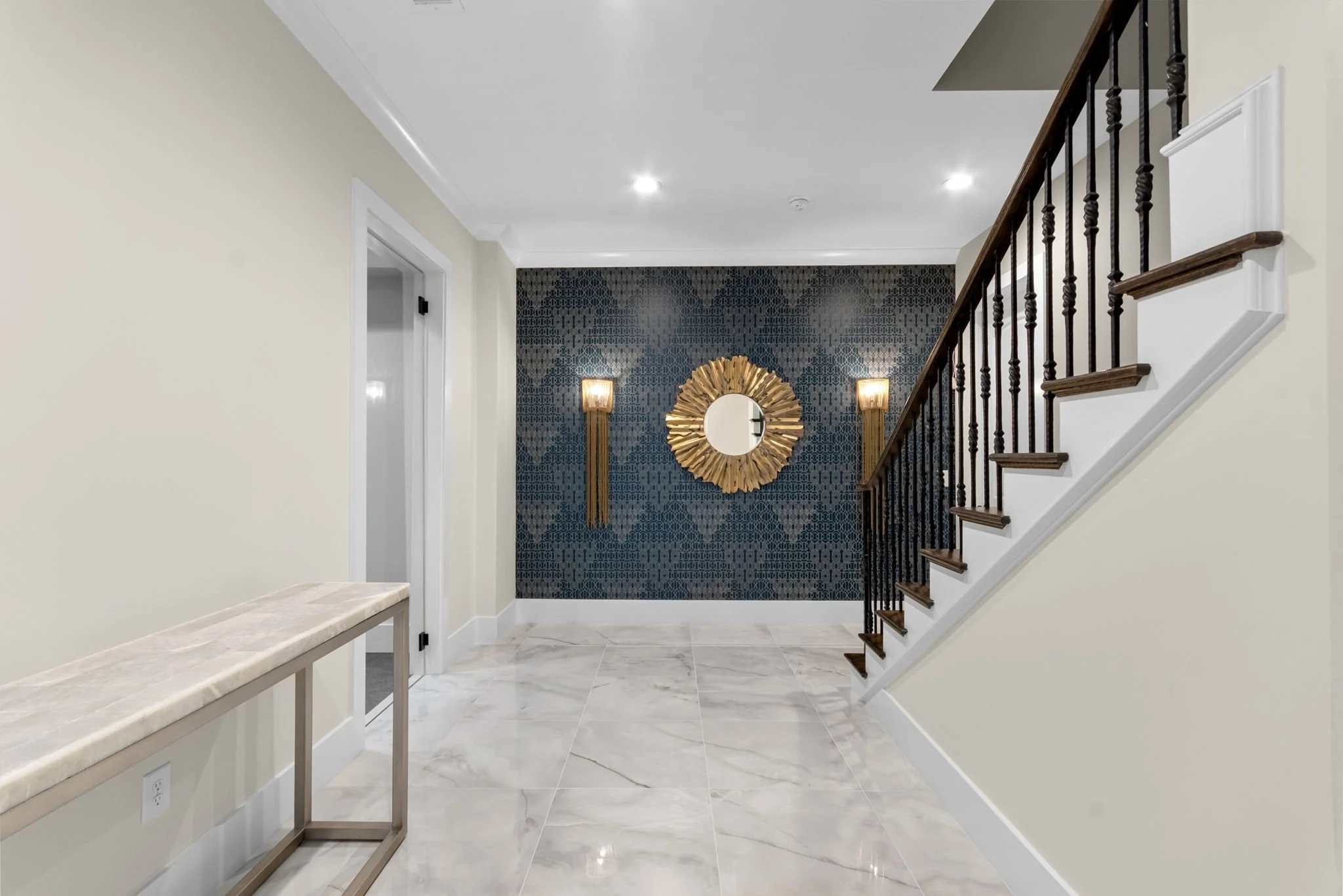 Adding to the allure, floating wine bottle displays cascade effortlessly, while custom granite vanity countertops in the guest bathroom exude opulence. Wallpapered walls add a touch of sophistication, completing the ambiance of refined luxury in every corner.